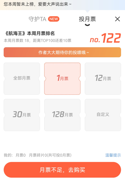 3、选择你想投的月票数,月票不足的话点击下方的【月票不足,去购买】就可以买月票了。
