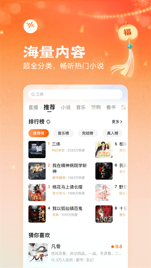 1、【抖音旗下】 番茄畅听是抖音推出的免费音频产品。免费听书,尽在番茄!我们提供正版免费小说,听书还能赚现金~ 2、【正版免费畅听】 海量小说,免费畅听!都市爽文、悬疑惊悚、言情穿越、玄幻修仙、 武侠江湖......超全分类,你想听的全都有! 3、【听书赚现金】 新人就有大红包!每天听书赚现金、签到赚现金、开宝箱赚现金......红包福利应有尽有,随时提现! 4、【海量精品书籍】 每日甄选精品好书,并根据您的阅读爰好推荐优质书籍,总有一本打动您!番茄畅听App怎么下载歌曲