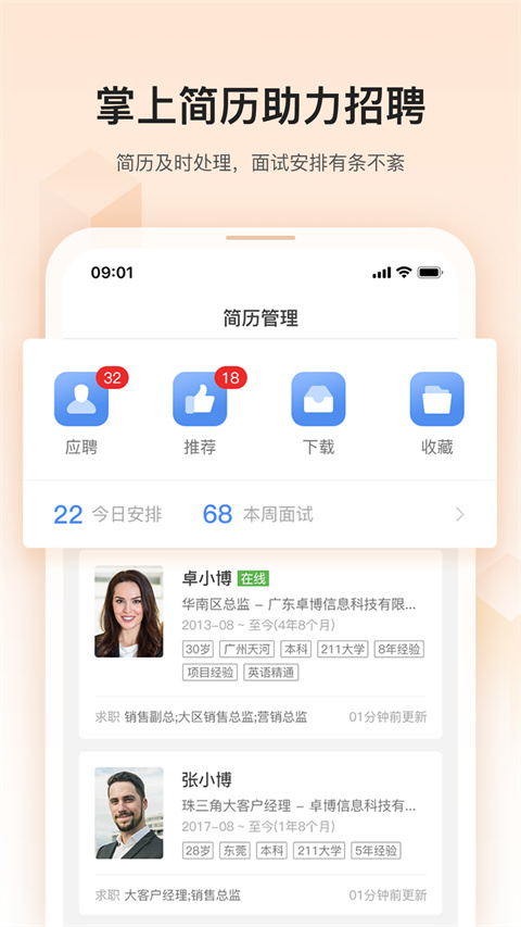 【求职服务】 1、【职位搜索】多条件组合搜索,快速寻找自己心仪职位; 2、【简历管理】与简历有关的操作都可以在这里完成,省时省力; 3、【应聘管理】求职消息都可以在这里查看,让求职动态了然于心; 4、【智能推荐】把与你相关的职位推荐到你面前,让职位不再溜走; 5、【海量职位】这里有海量职位等着你,赶快下载APP进来看看吧! 【招聘服务】 1、【简历搜索】海量英才任意搜,人才招聘更快捷; 2、【职位管理】职位状态一目了然,投递简历直观查看,随性分享高频曝光; 3、【职位刷新】即时刷新急招职位,实时提升职位竞争力; 4、【简历管理】投递和下载的简历随时处理,还可对简历进行相应的评价; 5、【面试日程】聚焦近期面试安排,快速更高效。卓博人才网app怎么注册账号
