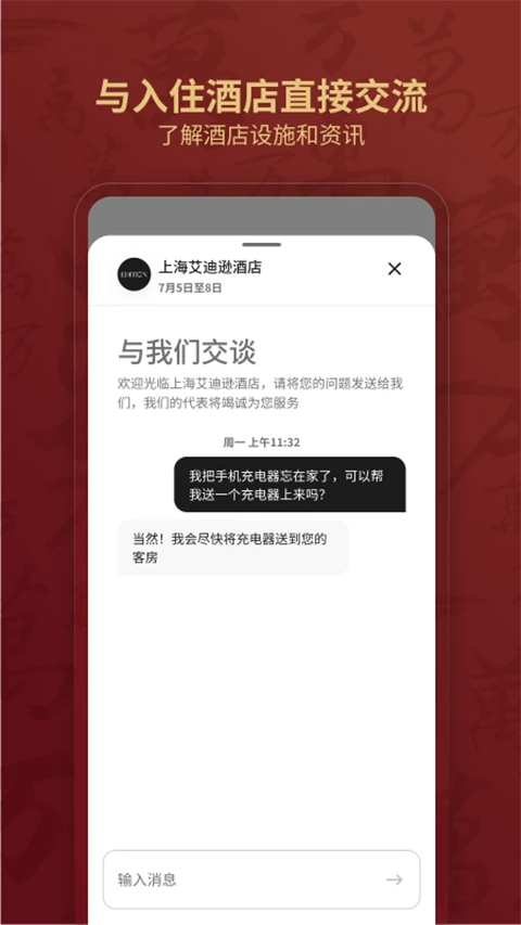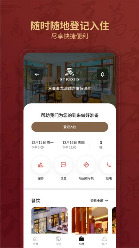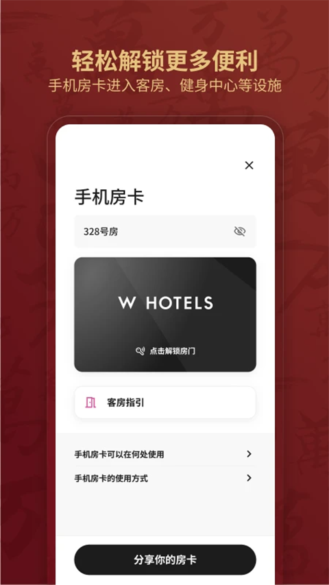 1、手机入住/退房: 抵达前48 小时办理入住预登记。 使用APP轻松退房,启程更加快捷。 2、尊贵级别礼遇: 获得优先升级机会和优先延迟退房机会。 3、24小时在线请求: 通过聊天功能联系酒店员工获取更多服务。 4、手机钥匙: 您可在指定酒店使用您的手机开启房门或探索酒店其他区域。更新日志