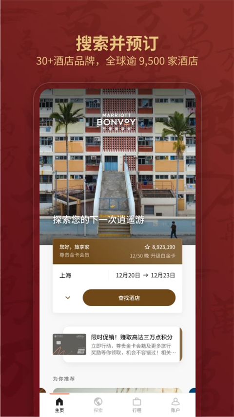 1、轻松注册: 通过手机 APP 免费注册万豪旅享家会员。 2、探索会员礼遇: 在“我的帐户”中了解全新礼遇和尊贵级别。 3、会员房价: 预订优惠房价,包括万豪旅享家会员专享房价。 4、促销活动: 参与促销活动,并关注进度和积分赚取情况。 5、帐户活动: 随时随地查看晚数记录、积分及活动历史。预订更轻松