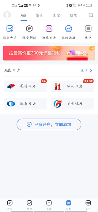 1、财经新闻 7*24小时追踪全球金融动态,政策风向,股票重大情报,投资机会一览无余。 2、全球行情 覆盖沪深港美英股市、债券、基金、期货、外汇、期权等行情。 3、自选股 支持全市场品种添加自选股,实时关注市场动向。 4、资金流向 沪深全市场实时资金轨迹,主力动向跟踪利器。 5、大数据诊断 基本面、新闻舆情、技术面、资金面全面诊断个股价值。 6、股市直播 财经大V深度解读股市机会,掌握股市先机。 7、智能预警 自选股智能预警,公告、研究报告第一时间推送到达。 8、开户交易 支持沪深、港股、美股开户和交易。功能介绍
