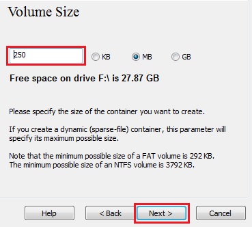 9、这里我们指定我们希望 VeraCrypt 容器的大小为 250 兆字节。当然,您可以指定不同的大小。在输入字段(标有红色矩形)中输入所需大小后,单击 下一步。