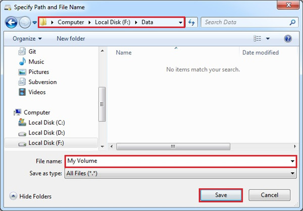 6、在本教程中,我们将在文件夹 F :\Data\ 中创建我们的 VeraCrypt 卷, 卷(容器)的文件名将是我的卷(如上面的屏幕截图所示)。当然,您可以选择您喜欢的任何其他文件名和位置(例如,在 USB 记忆棒上)。请注意,文件 My Volume尚不存在 – VeraCrypt 将创建它。