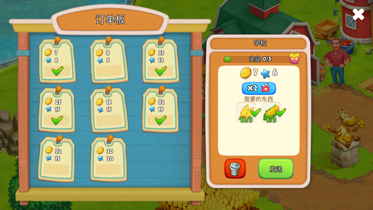 交付订单需要的物品,点击发送就能获得相应金币。