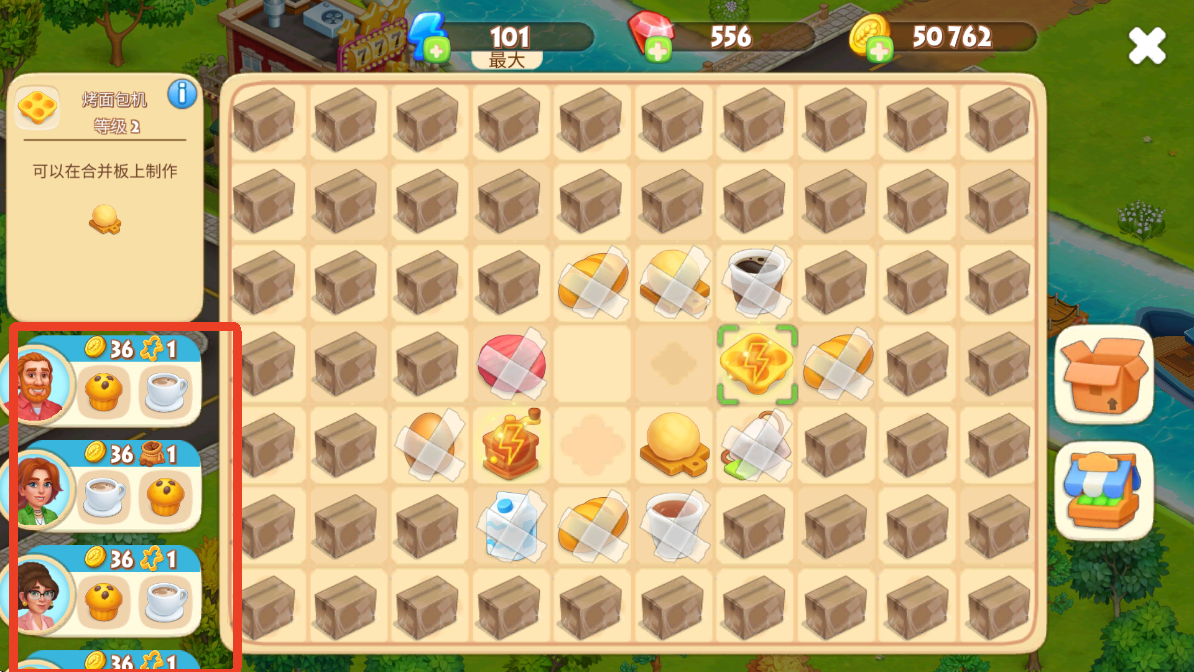 两个一样的物品可以进行合成,完成左侧顾客想要的食物,可以获得金币奖励。