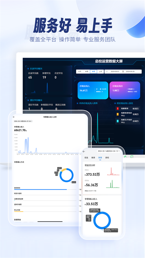 【招生营销】 - 微官网:精美微官网,可展示机构品牌形象、老师风采、明星学员,以及与家长的精彩互动 - 在线购课:家长可以通过小程序自主选择并购买机构的课程 - 分销、拼团:老带新裂变,促进机构招生 - 预约试听:家长自主提交试听申请,机构统一管理试听安排 - 线索跟进:协助课程顾问管理线索,记录跟进情况,提高线索转化率 【家校互动】 - 课后点评:支持图片、视频、语音等多种点评形式,点评自动通知到家长微信,支持与家长互动 - 作业:家长可线上提交作业,老师在线点评作业 - 成长档案:学员的成长情况汇总到一起,给家长有好的服务 - 积分:可用于学员激励,在签到、报名、上传作业等时刻自动发放,可用于报名抵扣现金、兑换礼品等 - 群发通知:支持批量发送自定义内容到学生/家长微信,并可查看已读未读状态 【智能排课】 - 批量排课:支持按周、按天批量排课,支持跳过节假日 - 可视化课表:日视图、三日视图、周课表,手机、电脑、pad上均可完美呈现 - 约课管理:学生可在老师可用时间内自主约课,支持集体班、一对一约课形式 - 冲突检测:排课时自动检测冲突,自动筛选出冲突的教室和老师 - 线上直播课:与一线直播品牌合作,提供线上授课解决方案 【课消/财务】 - 签到管理:支持手写签到、拍照签到等多种签到方式,签到后自动发送通知到家长 - 家长核对课时:转班、补课、临时课等情况智能汇总,方便与家长统一核对课时 - 多种收款方式:支持支付宝、微信、POS机刷卡等多种收款方式,让机构财务管理更规范 - 上课提醒:机构定义提醒规则,上课前自动提醒家长/孩子来上课 - 老师工资绩效:多种方式计算老师绩效,自动计算老师工资,一键生成工资单 【数据决策】 - 仪表盘:手机上全面呈现机构运营情况 - 课消统计:可查每日课消、剩余课消,可查看趋势以及分老师统计 - 财务统计:财务流水清晰记录,支持多种维度筛选,方便财务对账 - 计算确认收入:机构的收款只是预收,确认收入才是机构实际收入,满班可实时计算机构实际收入 - 运营统计:到课率、课评率、回评率等日常运营数据功能介绍
