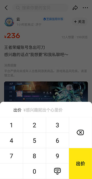 4、最后点击左下角的【出价】按钮,输入协商好的价格完成购买,卖家将会把游戏的账号密码私聊给我们。