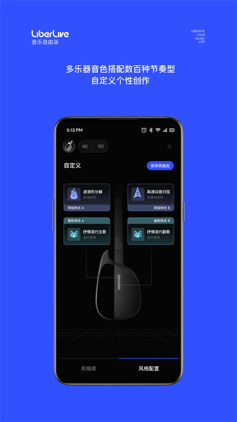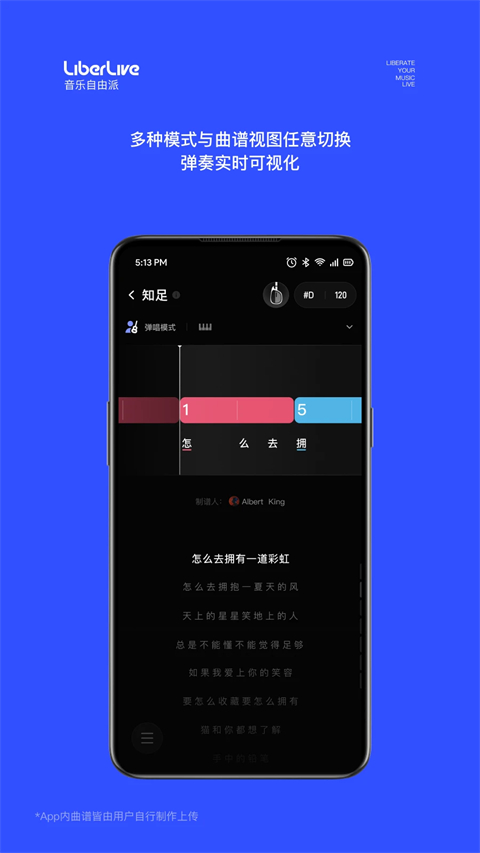 【交互式曲谱】 曲谱提示与硬件灯光联动,和弦色块实时推进提示 不同模式对应不同曲谱视图,玩法随心切换 【风格配置】 一键应用预设风格包,提升弹唱表现力 和弦样式、鼓机样式随心搭,演绎音乐个性 【海量谱库】 超百万玩家共创曲谱生态,每日更新不断 搜索/分类/谱集,哪里都能找到你喜欢的曲谱 更有自制曲谱,复刻与原创,由你来决定 【引导与教程】 跟随互动式新手引导,三分钟即可上手弹唱 视频教程专区,覆盖全功能玩法 轻松从入门到进阶,新手到高手 【一站式创作】 支持弹-唱-录-发,生成作品一气呵成 一键发布,随时与世界分享你的音乐 【全玩家社区】 玩家配置共享,一键复制使用 与兴趣同好社交互动,分享趣味与快乐 LiberLive生态硬件产品一起玩,激发更多创作可能 【更多设置】 自定义调号、速度,适合自己唱得才舒服 内置各种偏好开关,任你选择 2000+种高级和弦,定制你的指板键位,让演绎更细腻LiberLive怎么使用鼓机