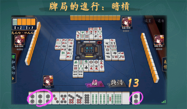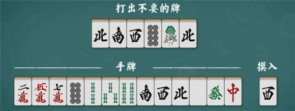 对局时,每个人手里常有13张牌,每回合摸1张组成14张,后打出一张。随著不断地摸入和打出,手牌将会不断变化。