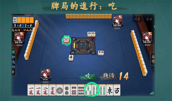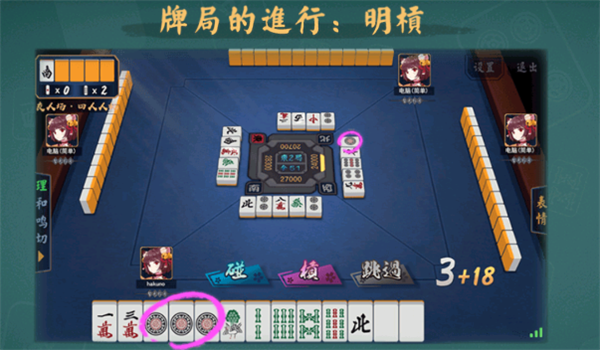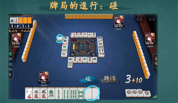 如果任意一个人打出了一张与你手牌中的对子相同的牌,可以选择点击【碰】将牌碰过来,连同手中的2张一起,摊开放在旁边。和吃一样,你也需要打一张牌出去。