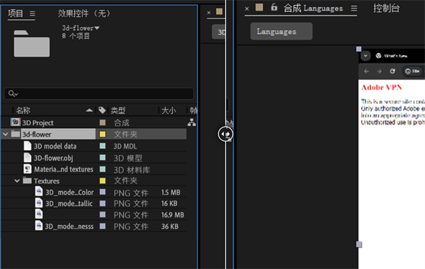 当您将 3D 模型导入 After Effects 时,项目面板的根级别中仅会显示主模型文件,而不是显示所有支持文件。这可使视图更清晰,从而可以更轻松地识别、管理和处理文件,而不会造成视觉上的杂乱。不显示模型所需的附属文件和相关文件,如素材文件、模型数据、场景配置、二进制数据和纹理文件。这种简化的方法有助于您将注意力集中在主模型上,而不会被支持文件分散注意力。
