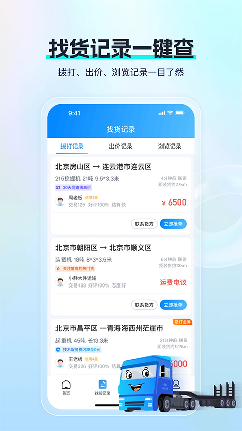 1、大件多、板车多、成交快,全国范围都能用; 2、货源信息真实有效,发货方全部实名认证; 3、货源信息智能推送,随时随地免费接收; 4、免费注册、免费试用,24小时人工客服贴心服务; 5、一键地图查询,距离、时间、费用轻松获知; 6、全天候天气查询,提前了解多地气象预报; 7、人寿人保两大保险公司加盟,车辆险、人员险,轻松搞定。更新日志