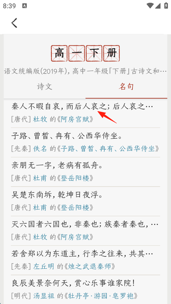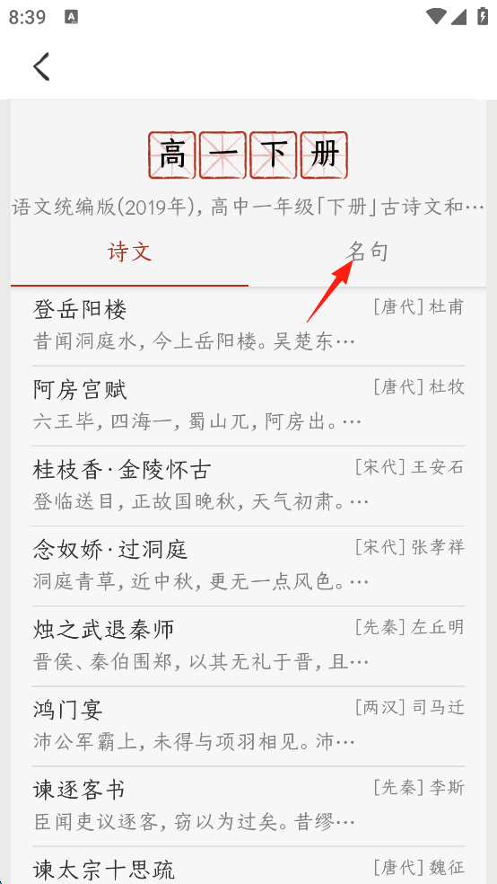5、这就可以看到高一下册的诗词名句了,随后可以点击进去查看原文。