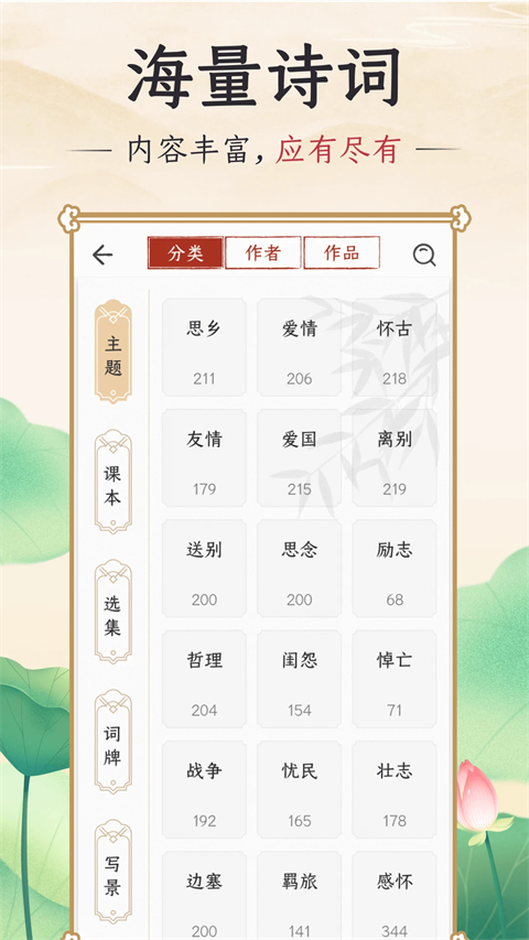 【诗词文库】百万诗词文库,按朝代、作者、作品等分类,包含注释、译文及赏析,发现中华五千年文明。 【诗词分类】精选分类包括:主题、选集、词牌、写景、名山、节气、时令、时间、节日、花卉、地理、城市、用典、课本等。 【诗词搜索】按朝代搜索:先秦、两汉、三国、晋代、南北朝、隋、唐、五代、宋、辽、金、元、明、清等。按作者搜索:李白、杜甫、李清照、王维、白居易、辛弃疾、孟浩然、杜牧、苏轼、屈原、李商隐、陆游、李煜、陶渊明、柳永等。 【诗词选集】唐诗三百首、古诗三百首、宋词三百首、长相思、西江月、诗经、乐府等。 【跟读背诵】名家朗诵,加深诗词理解和记忆。 【名句赏析】经典名句,感受古人用词之精辟。 【详尽解析】逐字逐句,注释翻译通俗易懂。软件功能