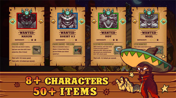 1、快节奏的roguelite动作 参与激烈的程序生成的弹幕战斗,每一场战斗都独一无二。 2、动态角色成长 使用独特的能力和强化道具定制你的英雄,以应对不断增加的挑战。 3、狂野西部场景 沉浸在充满活力、风格独特的狂野西部世界中,这里充满了不法之徒和赏金猎人。 4、无限可重玩性 每次游戏都提供全新的体验,包括不同的敌人、战利品和环境。 5、挑战性的Boss战 直面强大的Boss,考验你的技能和策略。一个人的悬赏手机版怎么设置中文