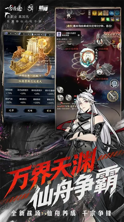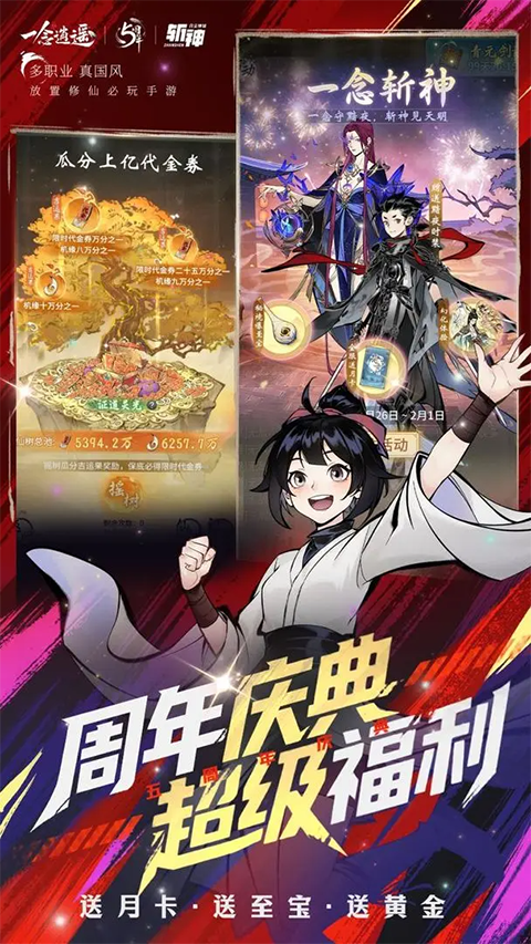 1、五周年我在一念逍遥斩神! 五周年全新大区【一念斩神】,将会有独占玩法——诸神隐域,在这里可以和林七夜一起扮演“神明代理人”,治疗神明、获取神力、组队斩神!体验传统修仙与都市玄幻的碰撞! - 新玩法:诸神隐域降临修真界,神域里沉睡中西方神明,有联动角色-黑夜女神倪克斯,也有首次出现的阎王殿主,“治疗”他们,可获取神明之力!对应提升不同属性! - 策略搭配:五大神明,有对应不同神墟能力,搭配职业策略性更强! - 经营神域:想解锁更多神力,你可通过日常玩法招募不同能力护工,灵活分配他们,协助你经营神域,更快治疗神明! - 组队斩神:迷雾下危机更多,与好友一起斩杀“外神”,守护清虚观 2、五周年大型庆典活动 周年活动【一念斩神】同时上线,玩家可通过【永夜赞歌】、【星夜赐福】、【凡尘奇旅】等活动获得联动限幻化·倪克斯、周年时装-天命星轨等限定内容,还有黯夜守望套装、大量资源免费赠送 3、五周年全新社交玩法 全新赛季制社交玩法万界天渊即将上线! 养成专属仙舟,与宗门好友组成仙舟战舰大阵,守护位面 更大战场,打破更多位面壁垒,与千宗争夺,最终称霸位面战场! 4、五周年超级感恩回馈 五载生万象,前路更逍遥 为了感谢大家的支持,这次周年庆,将会送出史上最多的福利,月卡、时装、代金券等资源登录即领,连至宝都可在秘境里直接挂机获得! 5、周年仙友回归 福利更多! 周年期间回归福利更多! 符合回流条件的仙友,在回归老位面后突破概率100%必成,任务支持快捷完成,炼丹炼器全面加速等体验优化 还有【仙途重聚】、【再续仙缘】等专属限时回归活动,可解锁大量资源、法宝、外观,助仙友轻松修仙!游戏截图