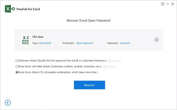工作原理:单击主用户界面中的“暴力攻击”,然后单击“恢复”按钮执行 Excel 密码恢复。