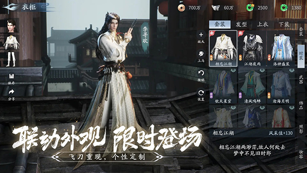 奕剑常着一袭素白武服,与昆仑山巅之雪同色,而其肩膀处的裘带更体现了极寒之地的特色。昆仑终年苦寒,奕剑却无畏季候,常以酒浇剑,勤于剑道修行,逍遥中仍有臻进之心。
