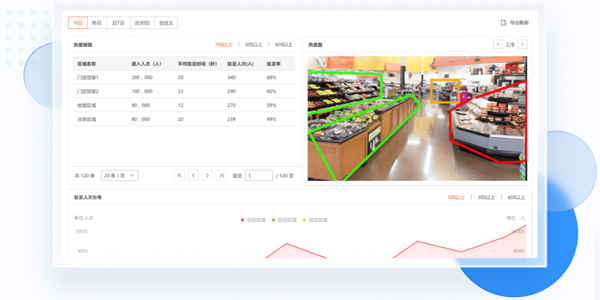通过区域内的进入人次、驻足人数和时长建立热区分析,利用热度图直观展示区域热度情况