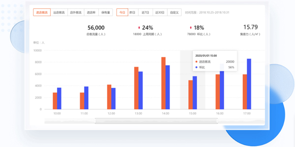 通过系统挖掘和分析对门店客流进行多维统计,区域门店和统计时间灵活查看,帮助企业管理人员挖掘数据,以数据驱动运营