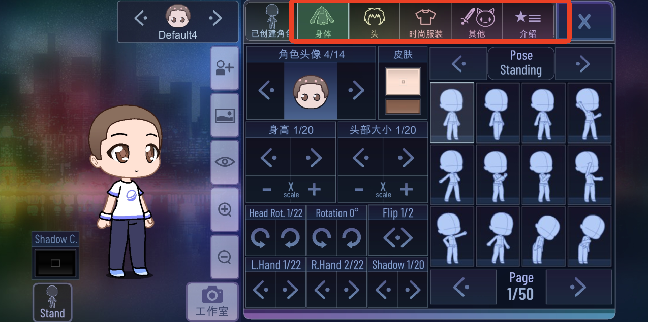 4、从体型和姿势开始,上面可以切换发型、衣服和饰品等,你可以更换超多的细节。