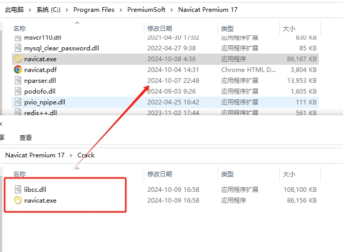 7、将Crack内的补丁复制粘贴至软件的安装路径文件内。默认路径【C:\Program Files\PremiumSoft\Navicat Premium 17】