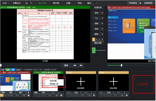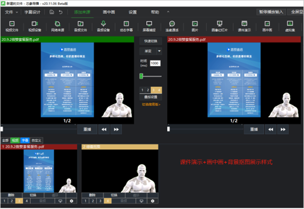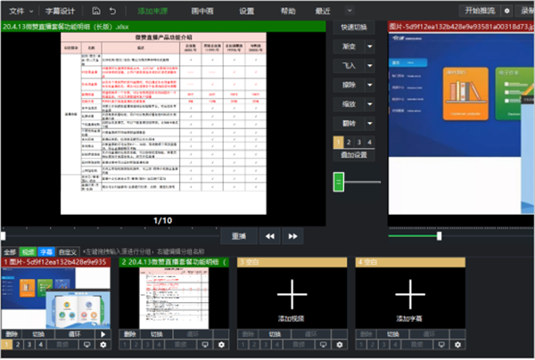 1、创建由多种来源组成的场景,多种直播需求全满足。 2、支持无限数量直播机位,过渡效果多种选择。 3、高级滤镜功能,调节需要的直播效果画面。 4、高级音频调节控制台,独立设置各音频参数。 5、多网聚合模式,高速可靠的网络保障。芯象导播如何添加课件演示