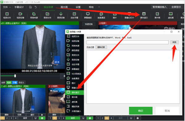 提前准备:课件PPT、检查网络是否正常 一、功能介绍 通过课件演示可以实现远程直播授课,用户可在线上观看直播课程。 二、使用场景 常用于企业内训、教育培训、远程会议等场景,可与画中画、背景抠图等功能结合进行“主播+PPT”模式直播。 三、如何添加课件 1、点击【添加来源-课件演示】可以添加课件进行课件演示(也可以通过点击【+添加视频】选择课件演示);