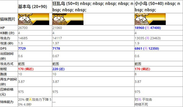 2、另外实战上,稀有猫的猫咪师傅、黑白熊熊可以几乎代替小小鸟猫的作用 (但猫咪师傅为单体攻击)。除非是执着于无课金攻略的大神玩家,不然平常是不需要使用小小鸟猫的