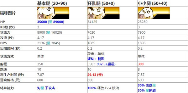 2、小小腿猫数值大多和基本腿猫相似。一样都是对异星敌人的角色,基本腿猫是 于攻击,小小腿则是给到击退的控场效果。相比之下,在正面对决方面,基本腿拥有更好的白板数值、加上 于攻击给予的血量加成;而在控场方面通常也都有超能力猫、漂流猫抢饭碗等