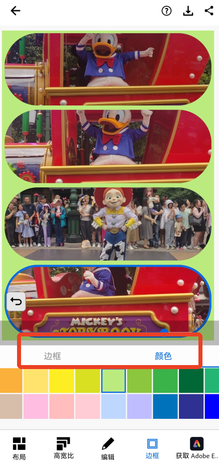 5、最后一步就是可以为拼图选择一个好看的边框和颜色,你可以从不同的位置调整这几张图片的边缘形状、每张图片的距离。