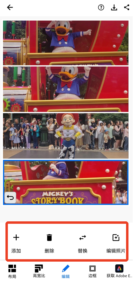 4、在编辑页面你可以添加、删除、更换图片,或者单独编辑图片,调整图片的参数。
