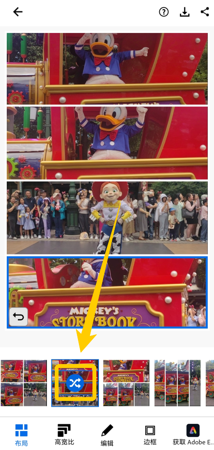 2、在下方我们可以选择多种不同的排版方式,点击中间这个交叉箭头会为你随机排列这个图片,你也可以长按某张图自行更换位置。