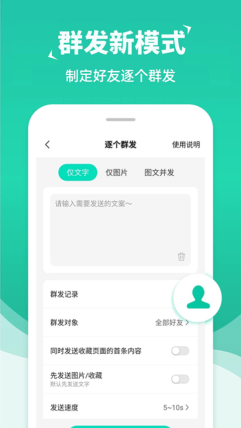 1、拥有多种群发功能,满足你的群发需求,所有功能免费使用。 2、一键即可实现图文并发,还可以支持多图群发,一次性发多张图片。 3、支持多种链接群发,让你轻松推广,快人一步做营销,群发的流程也简单。 4、在线即可实现勿打扰清粉,安全准确,高效快速,使用也简单。 5、应用的体积小,使用流畅,适应大部分版本的手机,不会出现卡顿现象。 6、软件中没有广告,在使用过程中不会出现广告弹窗,用户可以放心的进行使用。消息群发助手APP如何群发消息