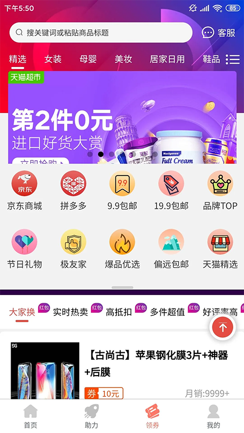 【搜优惠券】 全品类隐藏优惠券,下单前即可领取,可省钱80% 【返利专区】 全品类覆盖,网上购物专享返利,购物同时能赚钱 【猜你喜欢】 千人千面个性化推荐,精准定位你想买的超值好货 【爆品秒杀】 特价商品供你挑选,搜罗全网低价优惠券商品& 【0元嗨购】 电动牙刷、智能音箱、现金红包...超多福利无门槛参与软件功能
