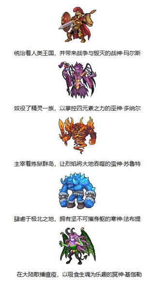 就在勇者大人在魔神领域冒险的同时,远征军发现了五座标记着魔神刻印的神秘高塔,根据调查的情报显示,这五座高塔属于“魔神之塔”,魔神的眷属们正试图使曾经被初代勇者击杀的五大魔神再次降临,它们分别是: