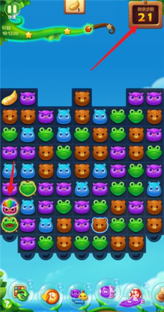 还有21步,只有一个豆荚没掉落,消掉魔力鸟。