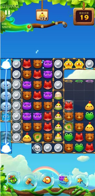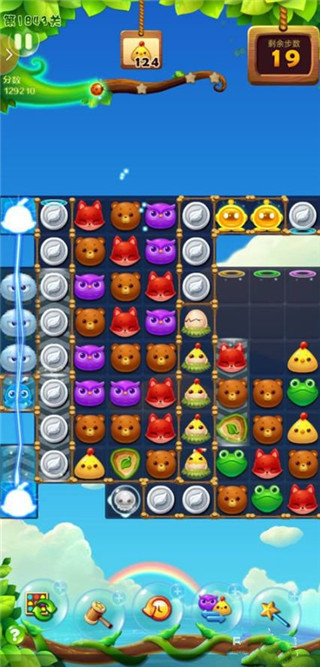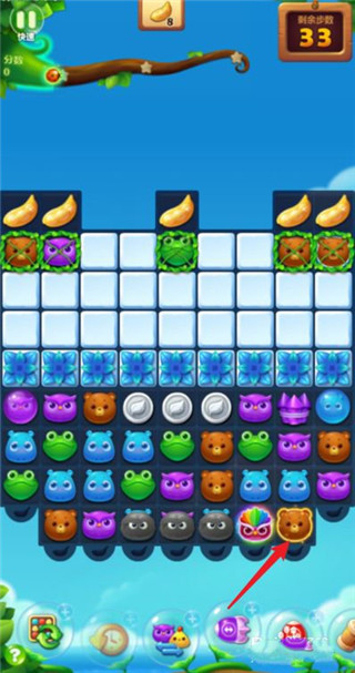 组合四个动物为发光动物头,魔力鸟出现时和发光动物一起爆,即可消灭上方的大量冰块块。