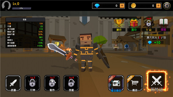 1、快速行动和各种技能。 2、矿系统,可以得到宝石(免费)。 3、各种武器技能。 4、各种武器装备升级系统。 5、武器推进制度。像素刀片M新手攻略