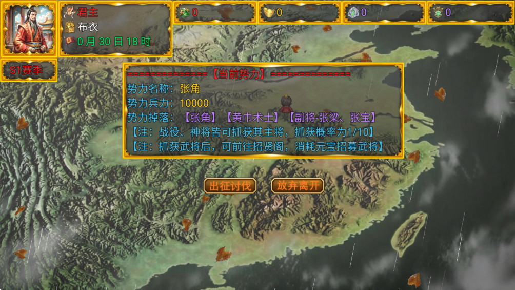 1.修复当前所有已知问题 2.调整新增【负面状态】逻辑,去除【魅力值】影响负面状态概率设定 3.调整新增【护盾状态】当武将自身持有【治疗】状态时,溢出的恢复值自动加载【护盾】【注:护盾上限为当前武将兵力值的50%!】 【注:当武将持有护盾时,受到伤害,优先从护盾中抵消!】 4.调整当前【战斗界面】并新增【护盾状态】显示 5.调整当前【神灵表】进行细化分类,保持一组神灵最多5个武将 【凶神恶煞:拆分武将出:吕布】 【四镇星君:拆分武将出:张辽、高顺】 6.调整针对当前多余的武将,进行新增全新的神灵 【神灵名称:周天星斗】 【神灵武将:吕布、张辽、高顺】 【神灵效果:友军或敌军释放普通技能后,45% 无条件模仿一次自身普通技能) 7.调整【魏蜀吴】净化将【刘备、鲁肃、荀或】技能效果新增【治疗】 8.调整修复当前【吴国-吕蒙】技能问题 调整前:对我方全体造成80%物理计策伤害,无视防御,100%持续善策,100%持续善武! 调整后:对敌我全场造成50%物理计策伤害,无视防御,100%持续善策,100%持续善武! 9.调整针对去除【负面状态概率跟魅力值影响】进行平衡 【注:眩晕、霜冻、蛊惑受到伤害时,25%概率解除状态!】 10.调整新增全新【副本-通天神塔】 【注:通天神塔无上限,战胜后随机从所有物品中选定一件获得1-10基数】 11.调整新增全新【副本-五星连珠】 【注:胜利后即时结算,随机1-100的蓝、橙、红宝盒】 12.调整新增全新【副本-神魔战场】,开放官职:★★霸主★★ 【注:纳入刷新极致,一年刷新四次,每次刷新随机:项羽、张良、秦始皇】 13.调整新增【共鸣石】,加成基于极品卷轴之上提升,副本-神魔战场掉落 14.调整小幅度上升武将属性上限 15.调整新增全新【副本-大汉皇陵】,开放官职:★★战神★★ 【注:纳入刷新极致,一年刷新四次,斩断大汉龙魂,斩汉室气运,登基为帝!】 16.调整新增全新【副本-汉末终焉】,开放官职:★★★至尊★★★ 【注:此副本为最终副本,打通后,即为通关!!!】游戏截图