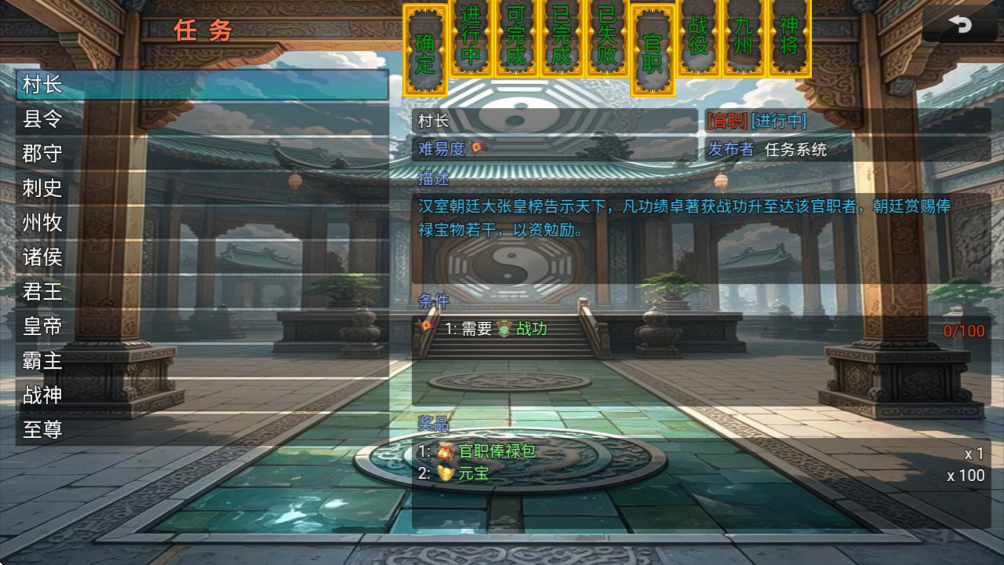 1、唯一获得途径【官职】,提升当前官职,累积战功可晋升官职从而获得元宝。