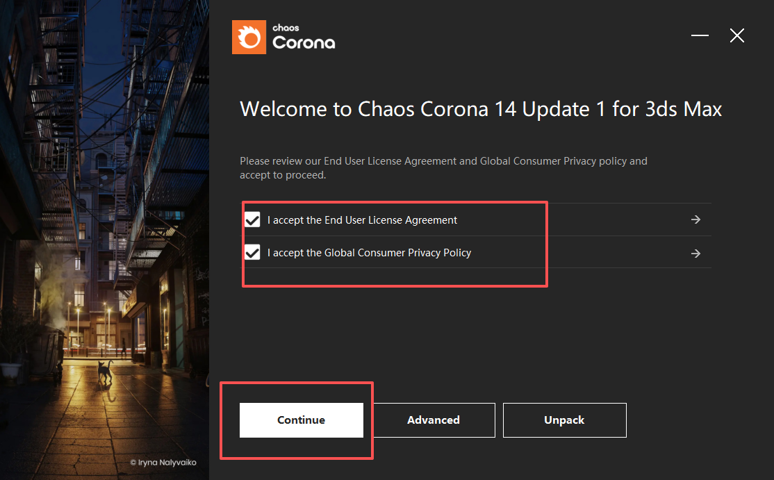 1、双击chaos-corona-14-update-1-3dsmax.exe开始安装;