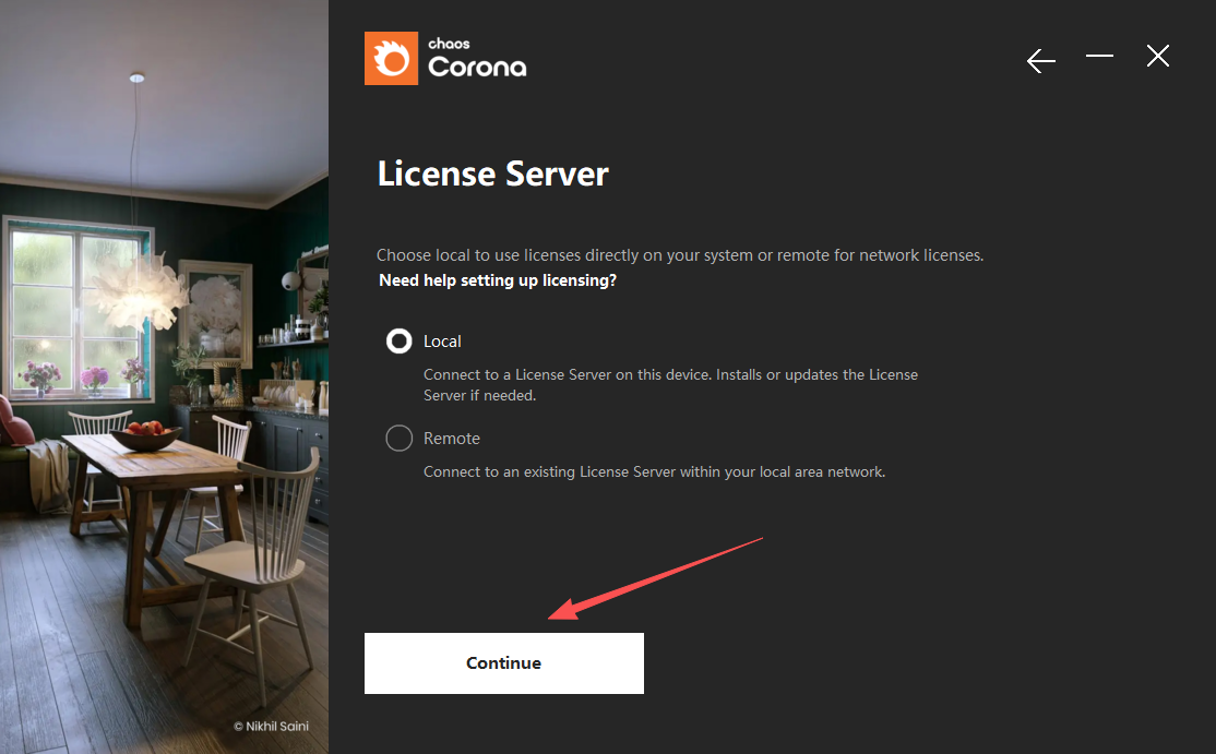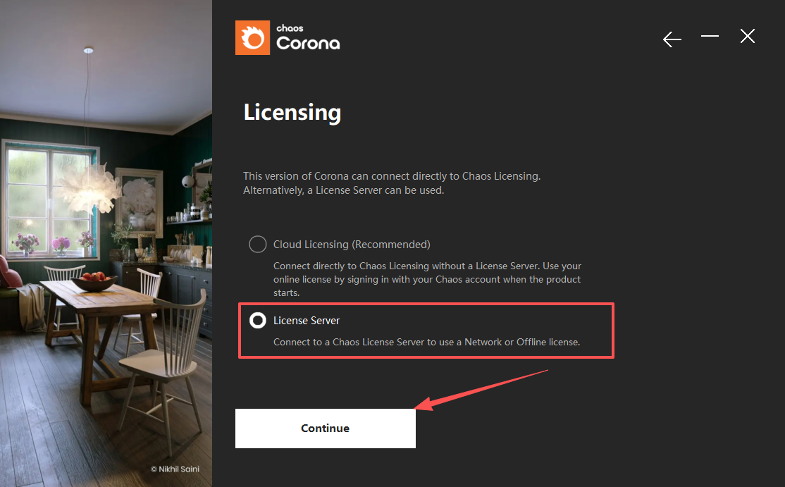 4、默认选择License Server,点击 Continue;