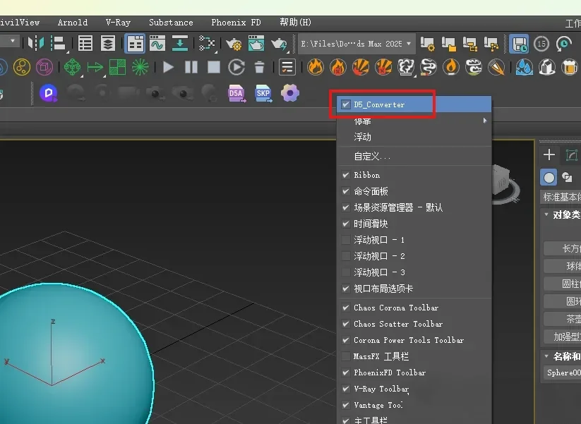 8、打开3ds Max软件,在工具栏就会看到(工具栏不显示可以在工具栏右键勾选D5_Converter);