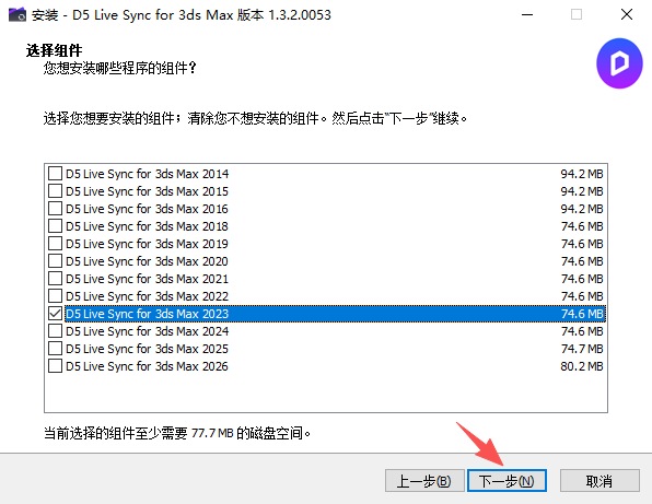 5、默认会自动勾选已经安装的对应3ds Max版本,然后点击下一步;