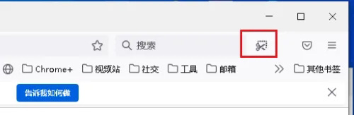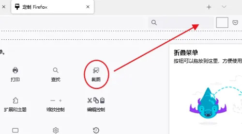 点击页面右上角三横图标,在下拉菜单里选择“更多工具>定制工具栏”然后用鼠标将“截图”移动到工具栏。