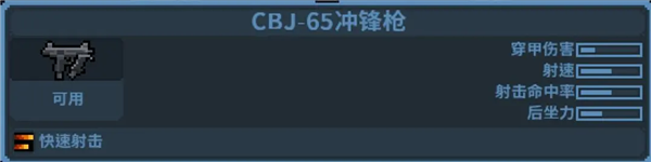 上面两把的整合体,比CBJ-65射速更快、射程更远、弹道更稳、有消声。但伤害略低。