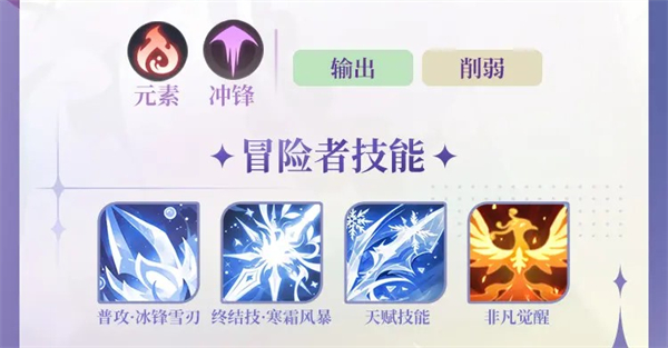 4、天赋技能:战斗开始可获得元素护佑,叠加伤害减免;释放终结技后能进行寒霜收割,造成真实伤害,降低敌方能量与异常状态抗性。