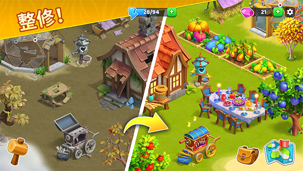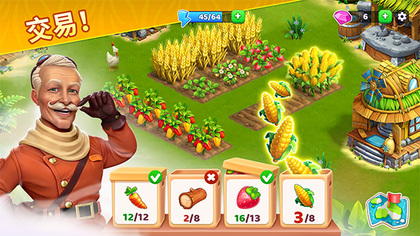 1、开发第一块农田 玩家在荒岛上的旅程现在是无止境的,所以他们需要开始建造最重要的东西来生存。游戏将引入一个深入的农场建设系统,包括农业、养牛、建筑设施等。每个功能都有更多的选项来提升玩家的体验,让他们有更多的享受,或者提升整体的生活质量。 2、构建基本结构 一个小村庄需要重要的建筑来处理从周围环境中收集的资源,从而允许玩家为村庄建造地基。每栋建筑的效果都不一样,可以让它们与某个区域互动,开始生产。同时,他们需要设计一个生机勃勃的农场,建造更多高级建筑,并开始为现在的生活生产新事物。 3、与农业的创新互动 玩家可以拖放和捏合以访问各种工具包,这些工具包使照料或收割农场比以往任何时候都更加方便。当然,这也适用于该地区的许多其他农场单位,帮助玩家快速工作并积极处理所有资源。 4、和谐的图形与友好的视觉效果 游戏中的视觉质量友好而可爱,呈现出充满活力的氛围,为玩家创造一个难忘的天堂。环境中每个元素的每一个视觉效果和交互都会有许多吸引人的展示,让一切变得生动活泼。此外,环境、人物、整体农场的设计,都会给荒岛带来新的感觉,充满活力和忙碌的氛围。 5、探索岛上的其他地方 百慕大冒险将以其独特的迷你游戏为玩家带来很多乐趣,因为它们拥有原始的设计并代表了这里失落的文明。一旦玩家完成了农场工作,他们就可以探索岛上的其他地方。同时,他们可以扩展他们的村庄并吸收他们从多个地点收集的新精华。 6、丰富而引人入胜的日常任务 每日任务系统被视为大多数玩家的主要收入来源,因为它们种类繁多,并且为所有内容提供丰厚的奖励。每种类型的奖励都有其价值,帮助玩家开发一个繁荣的岛屿并使每个角色都如此多样化。此外,它还有许多累积的奖励,当玩家达到他们的成就或最低配额并获得新物品、结构和服装等东西时,它就会解锁。游戏特色